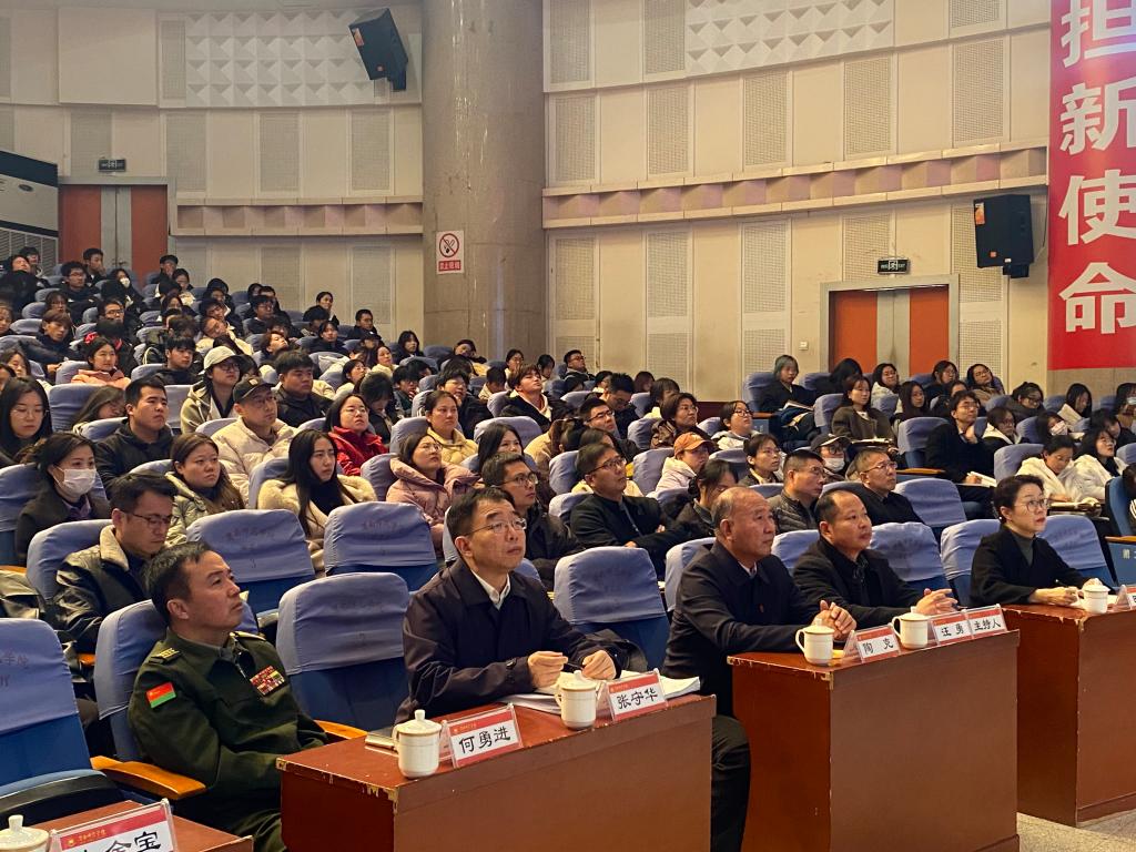 渭南军分区相关人员,学生工作部、人民武装部负责人及相关工作人员,各二级学院党总支副书记、全体辅导员,朝阳校区各二级学院学生代表近400人参加报告。