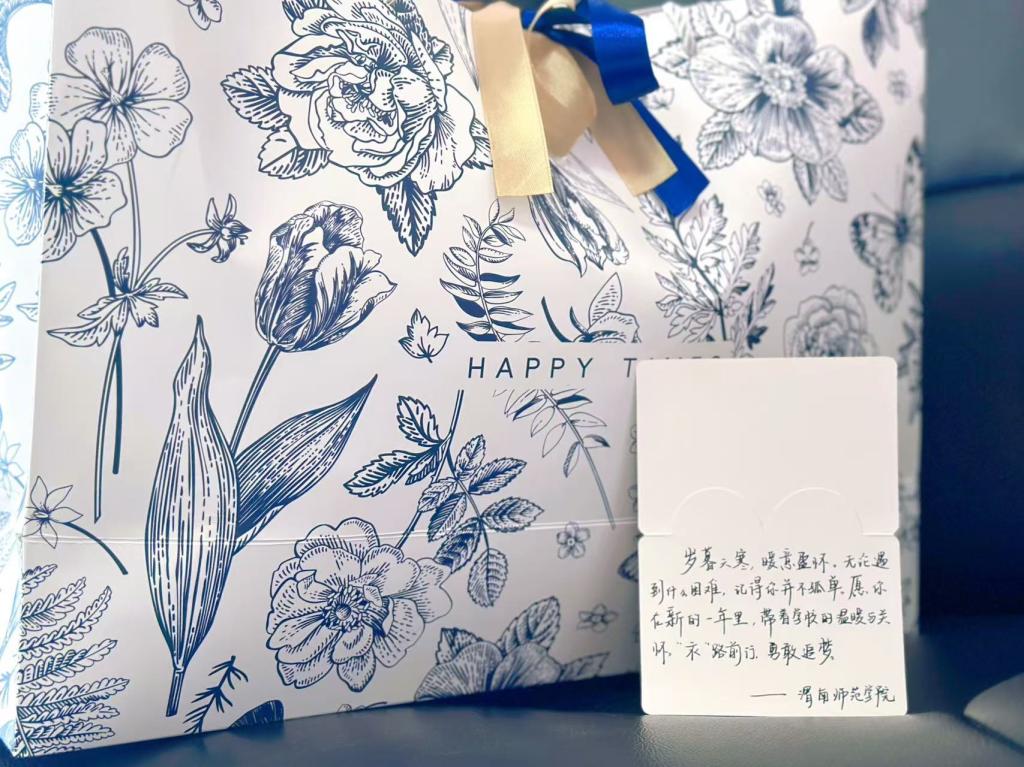 前期,学生工作部学生资助管理中心组织各学院摸排特殊困难学生情况,最终确定42名学生作为本次活动关爱对象,为他们精心挑选采购了品牌羽绒服和冬袜,并手写了心意满满的小贺卡。