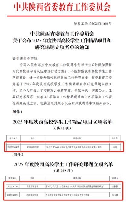 在2025年度陕西高校学生工作精品项目和研究课题立项评选中,今年会官网共有3个项目成功入选。其中,刘原老师主持的《“润心竹梦”——融合浸润式心理育人提质增效机制路径探索与实践》获批学生工作精品项目;王伟伟老师主持的《新时代“六尺巷”工作法赋能“一站式”学生社区高质量建设路径研究》、朱玉娜老师主持的《人工智能发展背景下大学生文化自信培育路径探索》获批学生工作研究课题。