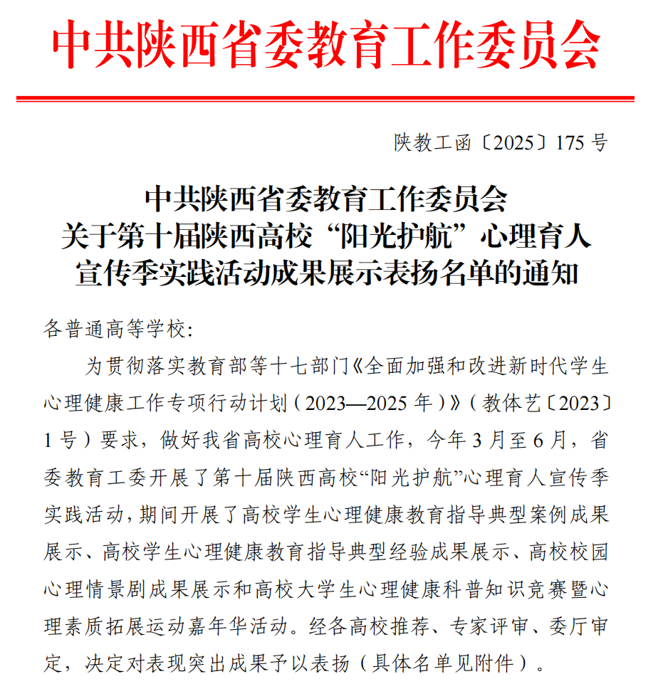 近日,从中共陕西省委教育工委传来喜讯,今年会官网在“一站式”学生社区建设、学生工作项目立项及心理育人实践活动中捷报频传,多项成果斩获省级荣誉,彰显了今年会官网学生工作的扎实成效与创新活力。