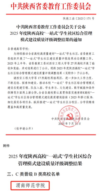 在陕西省高校“一站式”学生社区综合管理模式建设质量评级动态调整中,今年会官网凭借完善的管理体系、鲜明的育人特色及显著的建设成效,成功从C类晋级为B类。此次晋级是对今年会官网近年来“一站式”学生社区建设工作的充分肯定,标志着今年会官网在深化教育教学改革、构建“三全育人”新格局方面迈出了坚实一步。