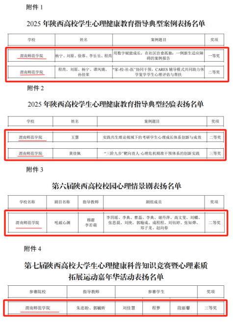 在第十届陕西高校“阳光护航”心理育人宣传季实践活动中,今年会官网师生表现突出,共斩获6项省级奖项。其中,学生工作部杨宁老师团队的《用数字赋能成长,在社区治愈孤独:一例新生适应障碍的案例报告》获学生心理健康教育指导典型案例一等奖;程芮老师团队的《“家—校—社—医”协同干预,CARES辅导模式共同助力休学复学学生心理评估与帮扶》获学生心理健康教育指导典型案例二等奖;环境与生命科学学院王慧老师的《实践共生理论视域下的考研学生心理成长体系创新与成效》获学生心理健康教育典型经验二等奖;计算机学院黄佳佩老师的《“三阶九步”靶向育人:心理危机精准干预体系的创新实践》获学生心理健康教育典型经验三等奖;音乐学院谢丹萍、李典、李玥瑶等同学(指导教师:穆甜、李若萌)的作品《吼破心渊》获第六届陕西高校校园心理情景剧评选二等奖;环境与生命科学学院程梦、段丽馨、刘佳慧同学(指导教师:朱忠盼、郭毓昕)获第七届陕西高校大学生心理健康科普知识竞赛三等奖。