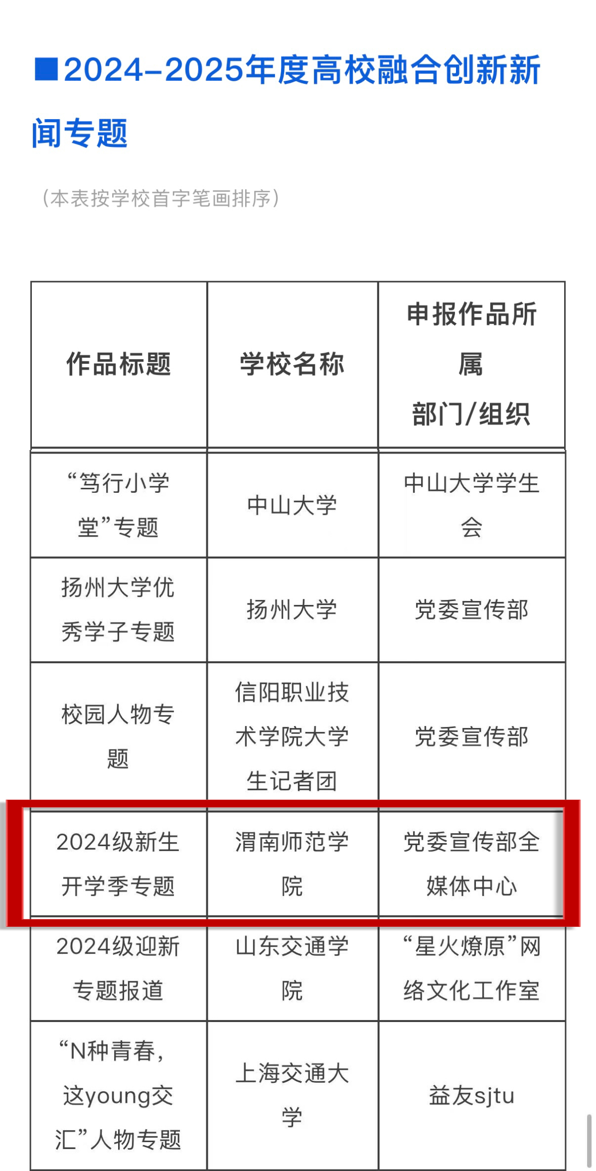 近日,由中国青年报社、中青校媒主办的“寻找2024-2025年度高校校园媒体融合创新案例”活动结果揭晓。学校宣传部全媒体中心报送的“2024年新生开学季”成功入选“2024-2025年度高校融合创新新闻专题”,并被收录至《高校新闻扶持计划案例集(2025)》,全国共评选“融合创新新闻专题”100项。