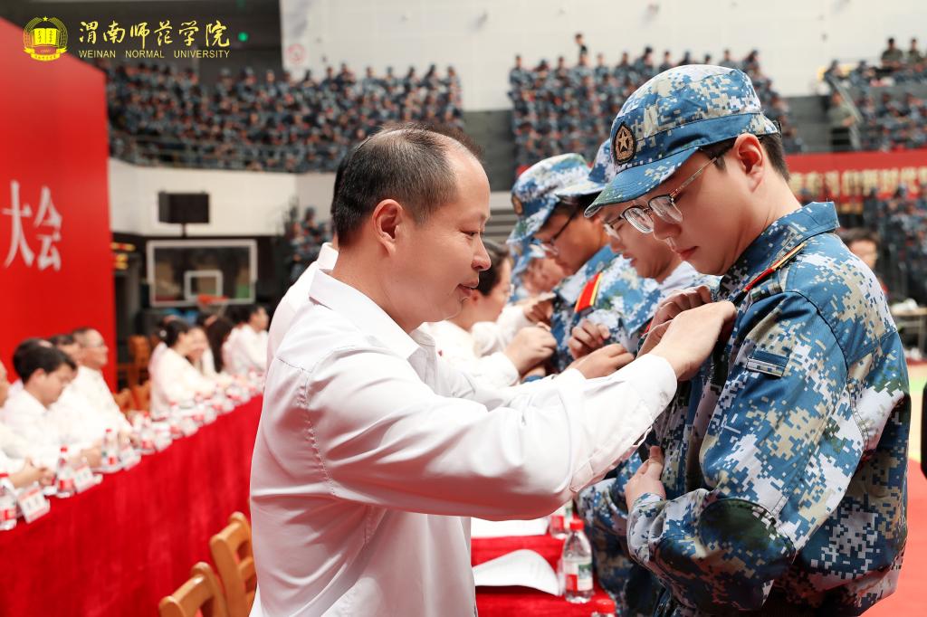 典礼现场,校领导为学生代表佩戴校徽,4000余名新生紧随其后,郑重为自己佩戴校徽。