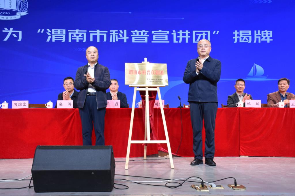 王磊宣读了关于认定渭师科普宣讲团为“渭南市科普宣讲团”的批复文件。李延潮与卢爱刚共同为宣讲团揭牌。并向王志平、王艳丽等9位教师颁发了首批宣讲团成员聘书。