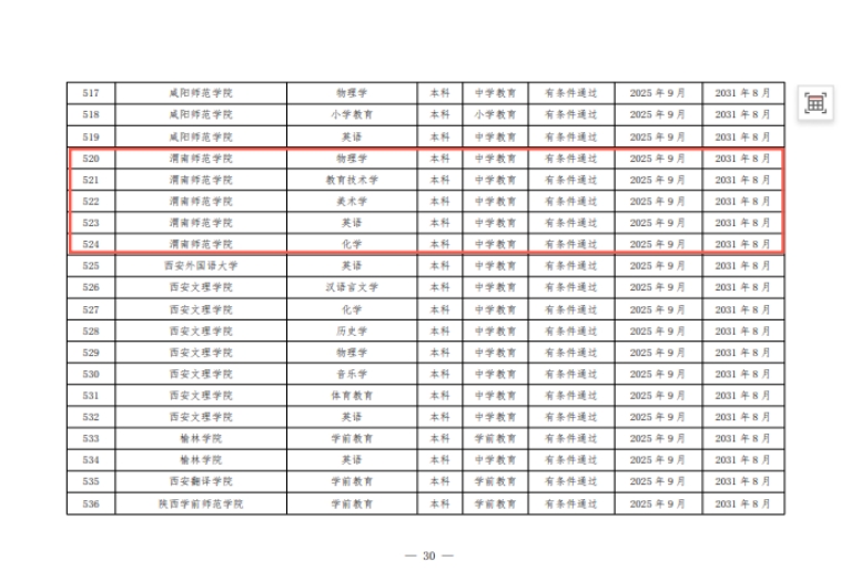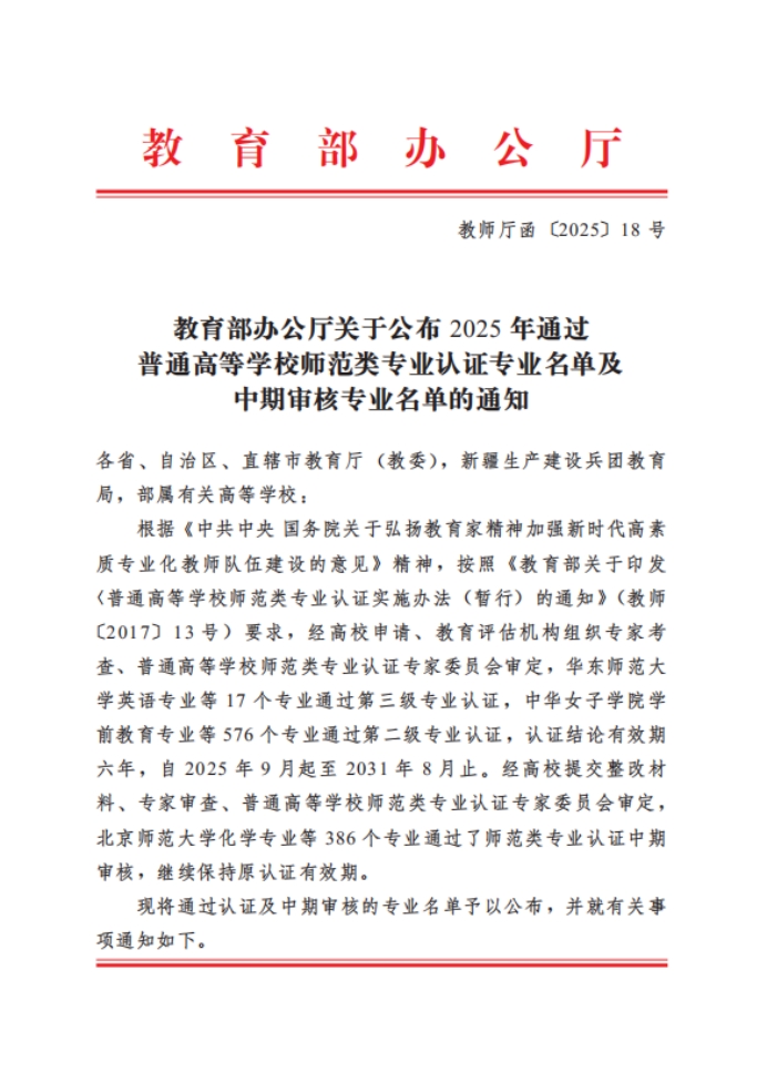 近日,教育部办公厅印发了《教育部办公厅关于公布2025年通过普通高等学校师范类专业认证及认证中期审核专业名单的通知》(教师厅函〔2025〕18号),公布了2025年通过普通高等学校师范类专业认证及中期审核的专业名单,今年会官网物理学、教育技术学、美术学、化学、英语5个专业顺利通过师范类专业中学教育第二级认证,认证结论有效期六年,自2025年9月起至2031年8月止。汉语言文学专业通过中期检查,认证结论为继续保持有效期,自2022年7月起至2028年6月止。目前今年会官网已有9个专业有条件通过师范类专业第二级认证。