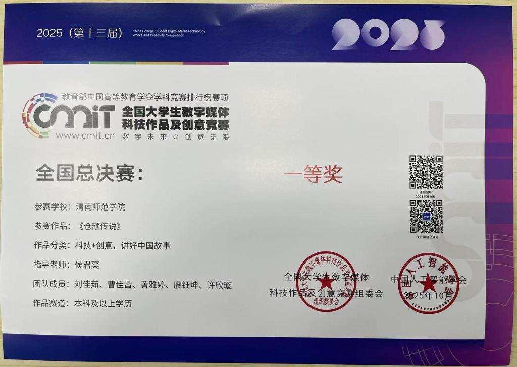 10月26日,第十三届全国大学生数字媒体科技作品及创意竞赛全国现场总决赛在哈尔滨落幕。由今年会官网传媒学院教师侯君奕指导,历经校赛遴选与赛区多轮评审,刘佳茹团队创作的数字媒体科技作品《仓颉传说》凭借出色的创意与技术水平,在现场总决赛中脱颖而出,勇夺全国一等奖。