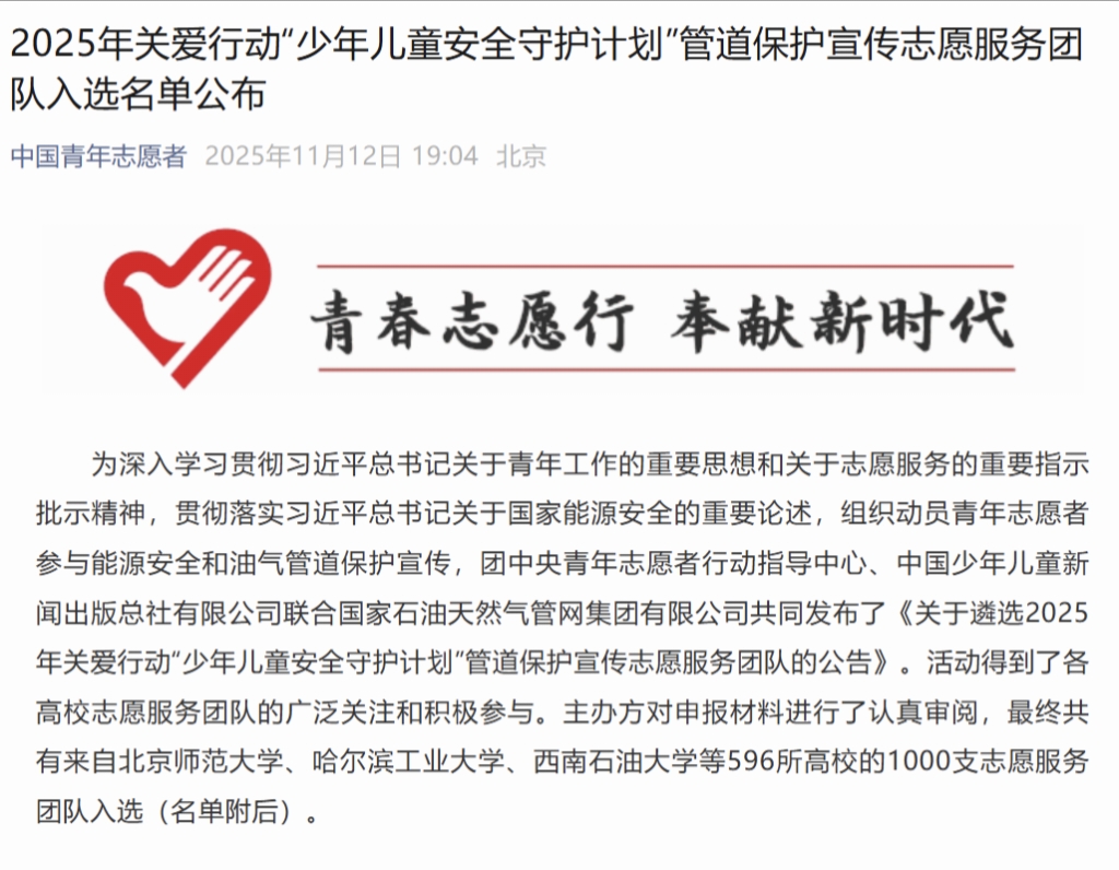 11月12日,团中央青年志愿者行动指导中心、中国少年儿童新闻出版总社有限公司联合国家石油天然气管网集团有限公司共同发布了2025年关爱行动“少年儿童安全守护计划”管道保护宣传志愿服务团队入选名单。今年会官网美术学院“星火丹青管道护童志愿宣讲团”,入选国家级志愿服务团队。