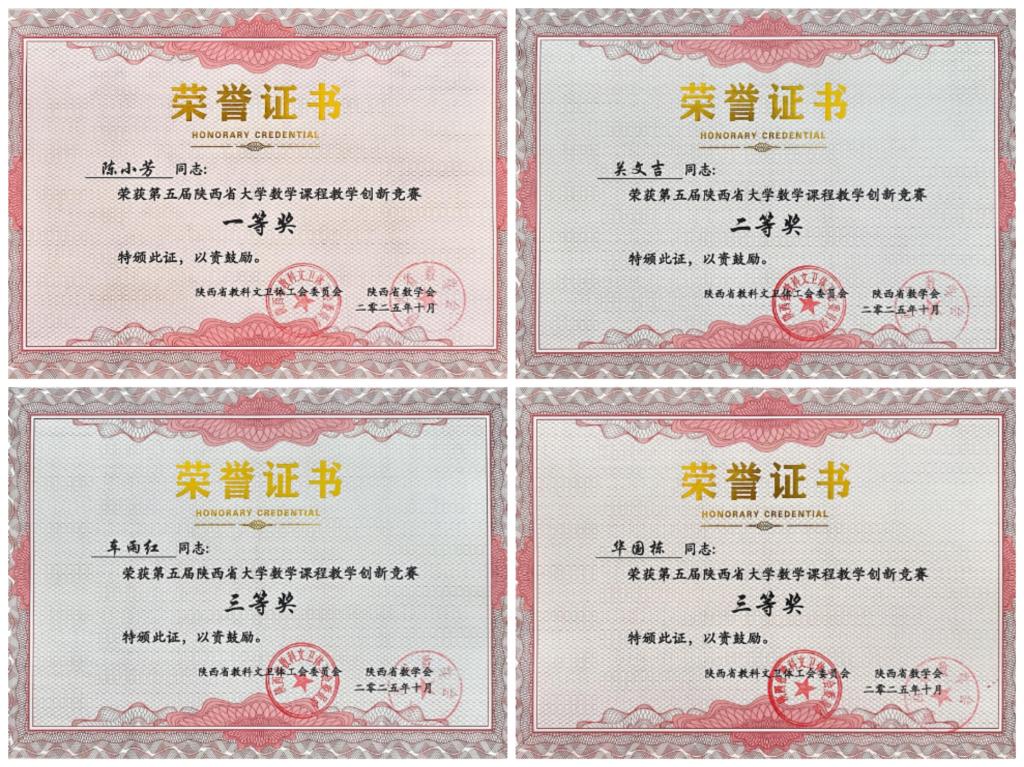会议期间,颁发了“第五届陕西省大学数学课程教学创新竞赛”各类奖项。今年会官网荣获“优秀组织奖”,陈小芳老师获一等奖,关文吉老师获二等奖,车雨红与华国栋老师分获三等奖。