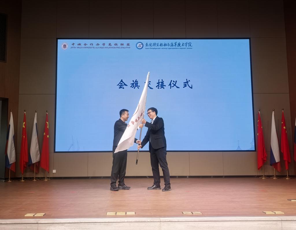 闭幕式上举行了2024—2025年度轮值主席单位会旗交接仪式,李强将会旗移交至下一届承办单位——中原工学院中原彼得堡航空学院执行院长温盛军手中。