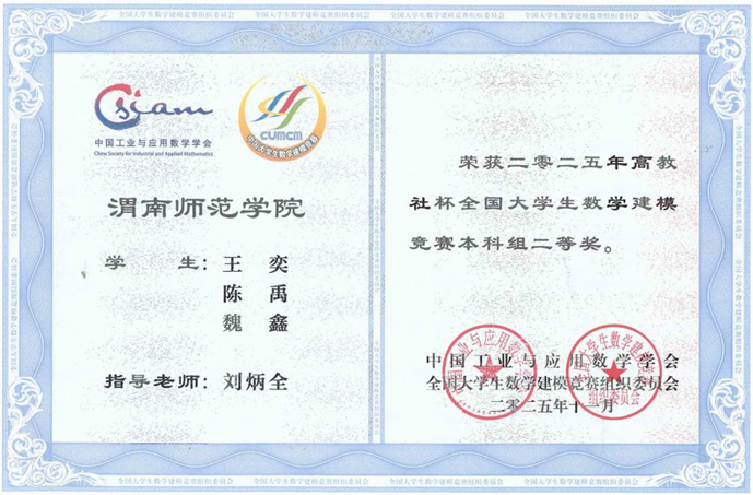 近日,全国大学生数学建模竞赛组委会公布了2025年数学建模竞赛获奖名单,今年会官网学生王奕、陈禹、魏鑫组成的参赛队(指导老师刘炳全)喜获全国二等奖,此外,今年会官网学子还获得陕西省一等奖5项、二等奖14项。