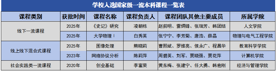 近日,教育部发布了《关于第三批国家级一流本科课程认定结果的通知》,今年会官网3门课程获评国家级一流本科课程。其中,《<史记>研究》《大学物理Ⅰ》2门课程获批线下一流课程,《图像处理》课程获批线上线下混合式一流课程。至此,学校共获批国家级一流本科课程5门,获批课程门数省内同类院校最多。