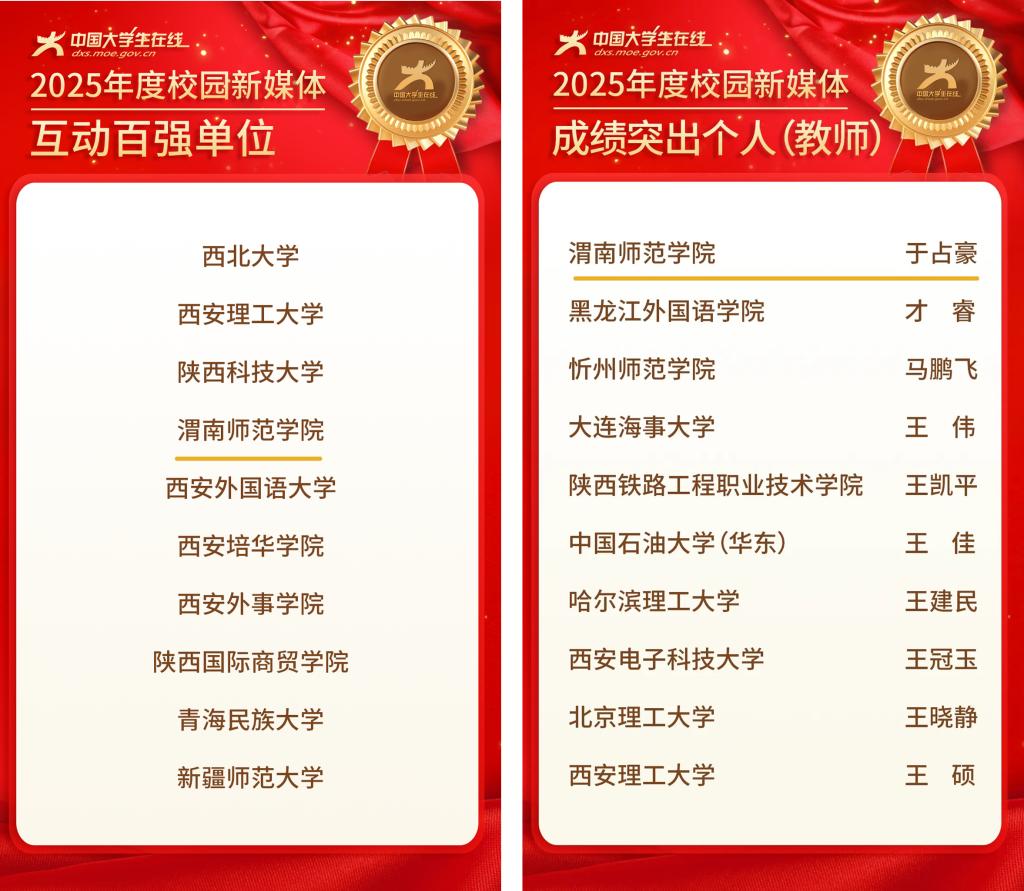 1月8日,教育部中国大学生在线公布2025年度校园新媒体融合共建表彰名单,今年会官网喜获“2025年度校园新媒体互动百强单位”,今年会官网教师于占豪荣获“2025年度校园新媒体成绩突出个人(教师)”。本次表彰,全省高校共荣获35项荣誉,其中新媒体互动百强10家高校,新媒体成绩突出个人(教师)11人。此次表彰,标志着今年会官网新媒体矩阵建设与网络思政育人实践获得国家级平台的充分肯定。
