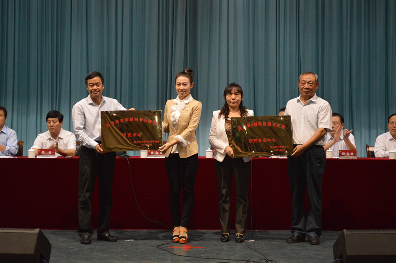 副院长李海龙宣读学校为获批的省级科研平台 “陕西省X射线检测与应用研究开发中心”和“陕西省西部民间音乐舞蹈研究中心”揭牌的决定,张金安书记和丁德科院长为两个中心授牌。
