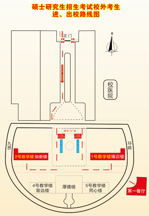 (1)校外考生凭本人准考证、有效居民身份证从学校北大门沿指定通道先到达学校广场存包处,然后进入1#教学楼(博识楼)、2#教学楼(知新楼)考区;