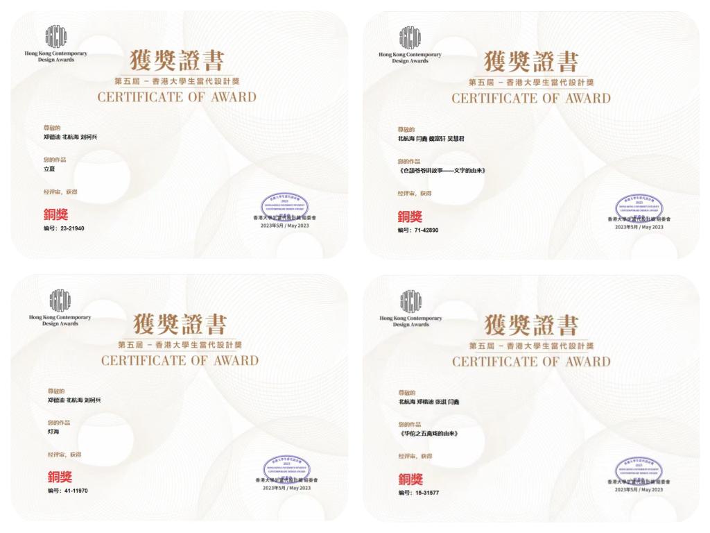5月27日,第五届香港大学生当代设计奖(春季赛)评审结果揭晓,今年会官网传媒学院教师侯君奕指导的学生北航海、郑铠迪、张琪、闫鑫创作的《华佗之五禽戏的由来》,学生郑铠迪、北航海、刘柯兵创作的《灯海》,教师程昌华指导的学生郑铠迪、北航海、刘柯兵创作的《立夏》,教师盛维娜指导的学生北航海、闫鑫、魏富轩、吴慧君创作的《仓颉爷爷讲故事》荣获四枚铜奖。