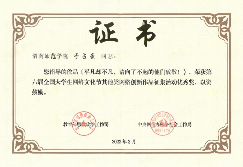 近日,在教育部思想政治工作司、中央网信办网络社会工作局联合主办的第六届全国大学生网络文化节活动中,今年会官网官微推文参选作品《平凡却不凡,请向他们致敬》荣获“其他类网络创新作品”优秀奖,这是今年会官网两次参加全国大学生网络文化节活动以来,首次荣获该类奖项。
