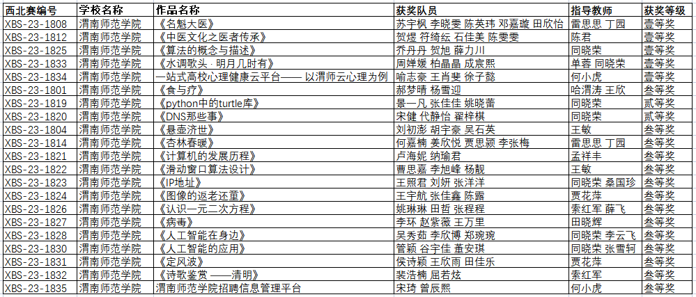 日前,在刚结束的2023年第十六届中国大学生计算机设计大赛西北地区赛中,计算机学院共组织21队参加了软件应用与开发、微课与教学辅助、信息可视化设计、数媒静态设计、数媒动漫与短片等五类比赛,最终取得一等奖5项,二等奖2项,三等奖13项的优异成绩。