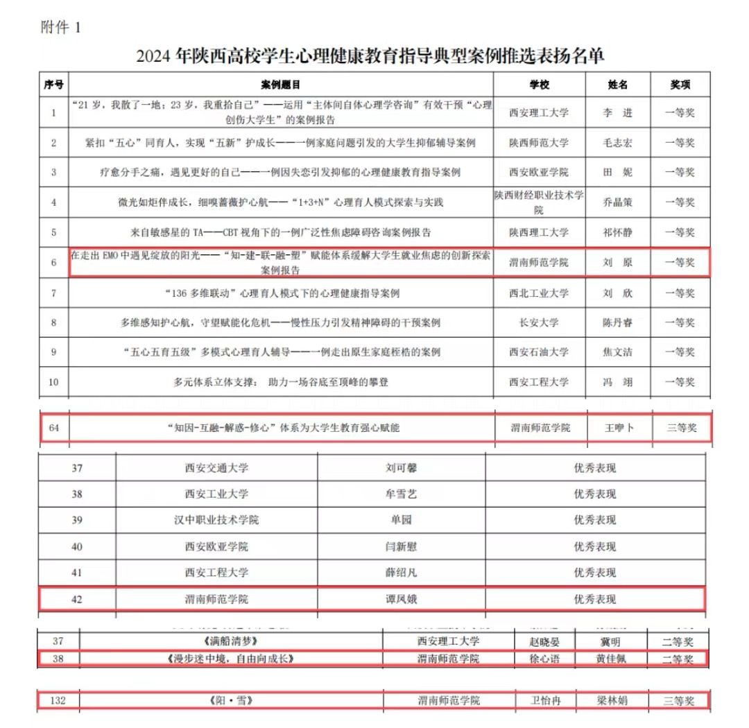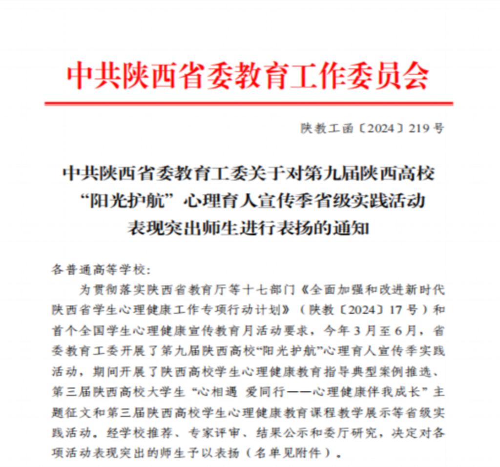 近日,陕西省委教育工委公布了第九届陕西高校“阳光护航”心理育人宣传季实践活动的评审结果。经校内评选、学校推荐、专家评审、委厅审定、结果公示等程序,今年会官网师生共斩获5项奖项,分别是2024年陕西高校学生心理健康教育指导典型案例一等奖(1项)、三等奖(1项),第三届陕西高校学生心理健康教育课程教学展示活动优秀奖(1项),第三届陕西高校“心相遇 爱同行——心理健康教育伴我成长”主题征文二等奖(1项)、三等奖(1项)。