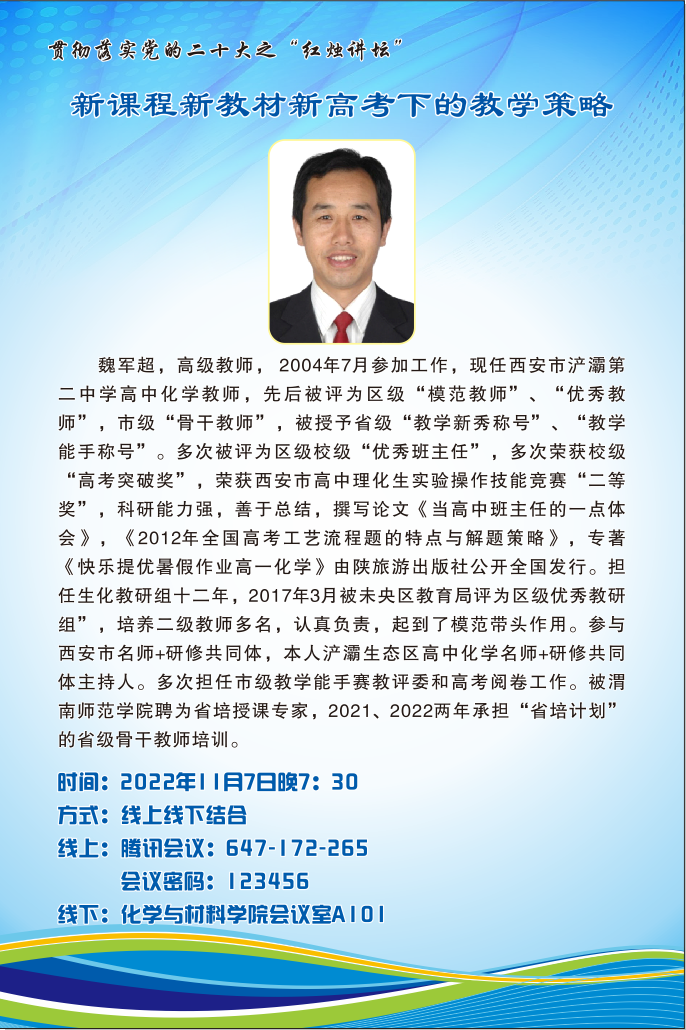 11月7日晚,化学与材料学院邀请2000级优秀校友、西安市浐灞第二中学化学教师、省级教学能手、市级教学骨干,jinnianhui今年会省培授课专家魏军超做客“红烛讲坛”,并以《新课程新教材新高考下的教学策略》为题作了专题报告。教学副院长刘展晴、部分无课教师、2020级、2021级师范生230余人,采用线上线下结合的方式参加了此次报告会。会议由教学秘书郑博主持。