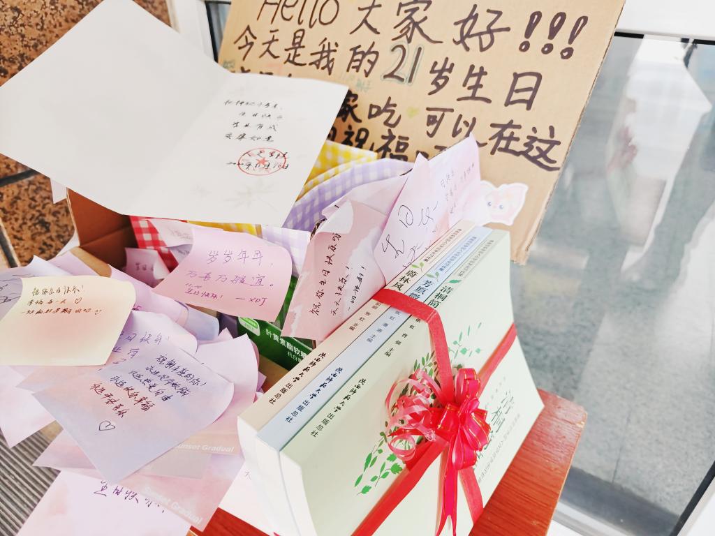 11月10日早上,人文学院包联的12号学生公寓外摆放着这样一块特殊的“留言板”,一位神秘小寿星迎来了自己的21岁生日,她在公寓门口放上糖果,跟大家分享生日的喜悦。短短时间内已经收到了不少同学的祝福。