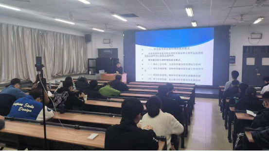 仵晓民详细讲授了综合竞赛的管理与组织,分别赛前、赛中、赛后给同学们做以细致阐述,并分享了自己多年来的工作经验,告诉同学们开展体育竞赛一定要具有可行性。
