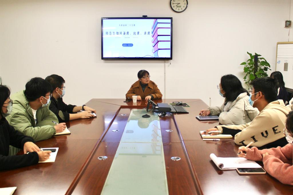 张晶首先向同学们介绍了陈西洁老师。陈老师先后荣获省级教学能手,校级教坛中坚、教学能手、教学名师、教书育人楷模、最美教师等荣誉称号。近年来,陈老师指导学生参加各级各类师范生技能竞赛,取得了丰硕的成绩。她希望同学们能利用此次机会,大胆提问,事无巨细,跟着陈老师学习备课、说课、讲课,切实提高师范生基本功。