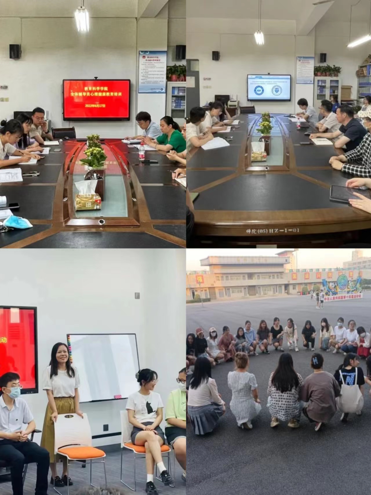 ——开展心理健康培训·心理团辅系列活动。教育科学学院高度重视辅导员、心理委员的心理培训,本年度组织辅导员、心理委员开展心理专题培训共4场。学院特邀陕西铁路工程职业技术学院心理健康教育中心主任赵智军,教育科学学院副院长、心理学专业指导教师马雅菊做专场报告,就心理危机干预、高校实践案例分析、辅导员谈心谈话技巧等为辅导员提供专业化指导。组织各班心理委员开展团体心理辅导,通过设计主题游戏,让参与学生全身心投入到活动中,充分体验、感受、分享,发挥自我能动性。通过主题团辅启发参与者深刻理解团体凝聚力和团队合作精神的重要性,引导其充分发挥心理委员的重要作用,为班级心理健康建设贡献力量。