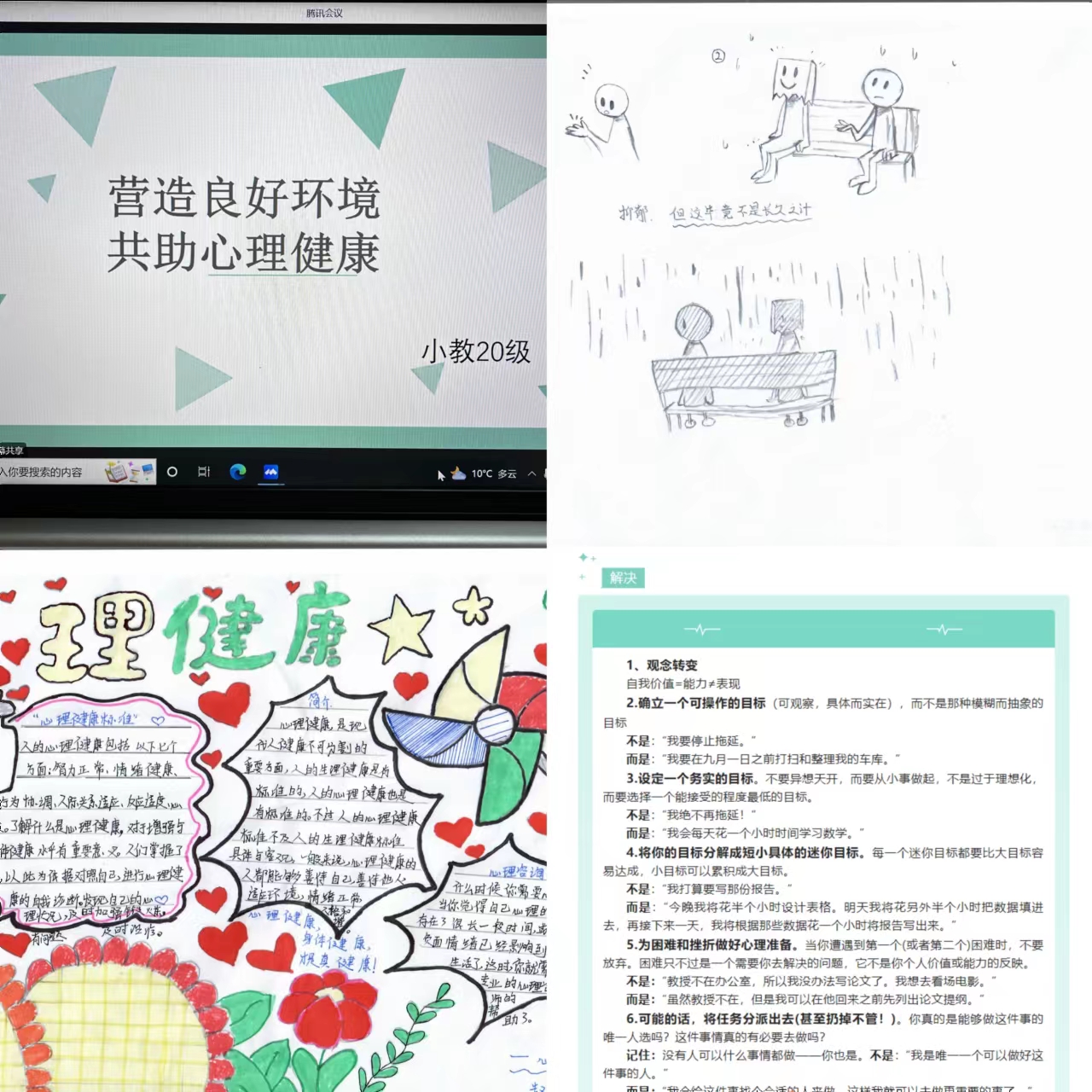 ——开展“营造良好环境·共助心理健康”系列活动。为进一步强化和增进学生群体心理健康意识,提高学生心理健康水平,加强学生心理健康和精神卫生工作宣传力度,教育科学学院今年10月组织开展“营造良好环境·共助心理健康”系列活动,活动形式包括:主题班会、漫画制作展览、手抄报展览、心理健康科普网文推送等。通过主题活动,使同学们明白面对丰富多彩的大学生活,应树立正确的心理健康观,正确把握心灵的准绳,懂得自我调节和适应,让自己度过一个愉快而又充实的校园生活。