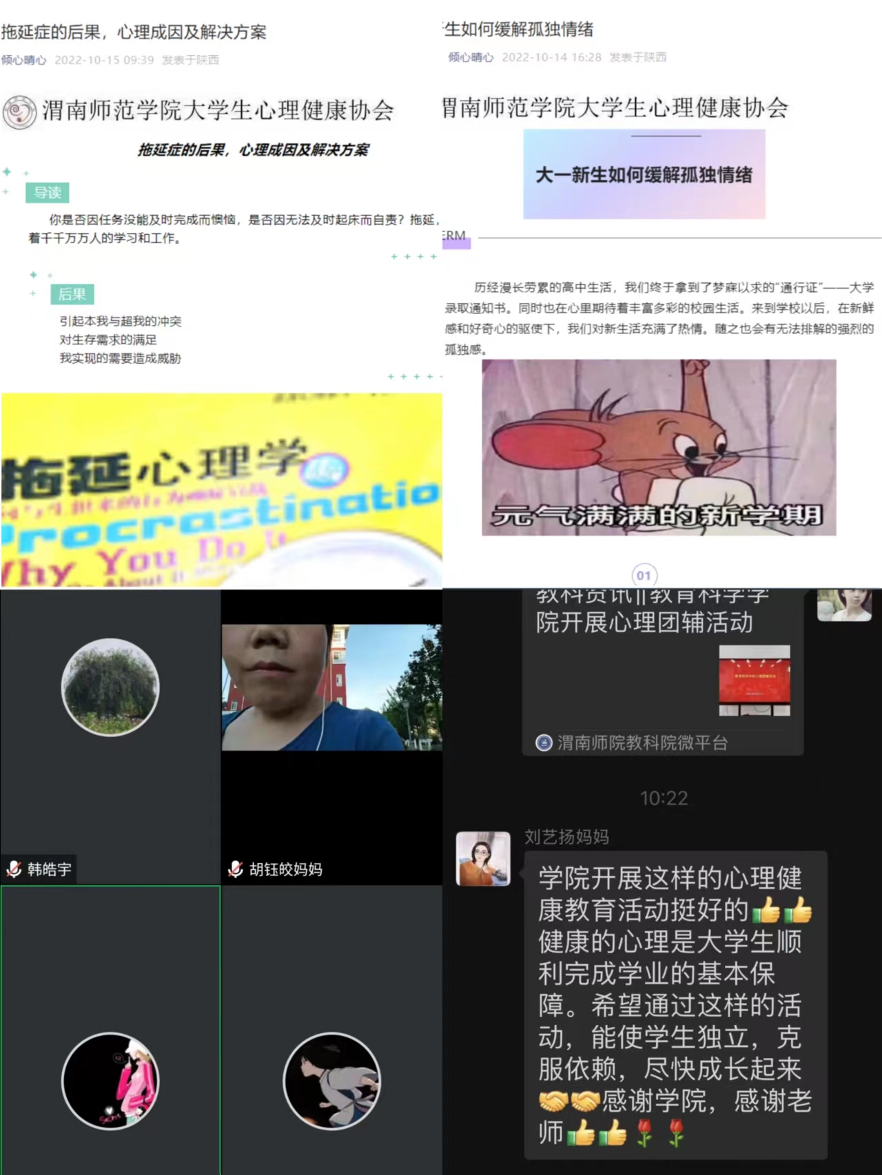 ——开展筑牢“家校合作”体制系列活动。为进一步做好学院“家校合作”相关工作,学院通过多种方式增强家校互动。心理学专业委员会利用专业优势,在“倾心晴心”专栏发表心理科普文章,并及时推送学生工作群、家长群,把专业的心理健康知识更好的科普给大众。截止目前已发表“大一适应生活心理健康”、“封控期间大学生如何缓解焦虑”、“大学生抑郁症的危害及预防与解决方案”等文章20篇,师生及家长反响热烈,工作成效显著。同时定期召开线上家长会,方便家长了解学生在校动态,及时了解家长诉求,畅通交流渠道,收集合理意见建议并推动整改落实,有力促进“家校合作“开展。