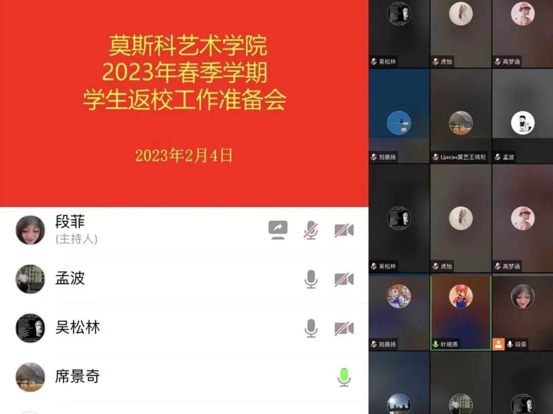 2月4日上午,莫斯科艺术学院召开2023年春季学期学生返校工作准备会。学院党总支书记孟波、执行院长席景奇、党总支副书记叶晓燕及全体辅导员参会,会议由学工办副主任段菲主持。