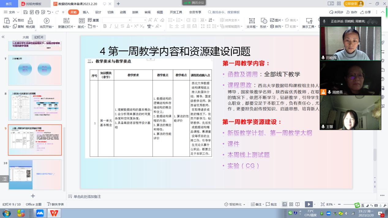 数据结构课程组以腾讯会议方式进行集体备课,参会人员为数据结构课程组田晓辉、周碧英、王敏三位老师。备课内容包括:2021-2021-2学期数据结构试卷分析、教学反思;本学期学情分析; 平台选择、本周教学内容和资源建设等问题,通过集体备课,商讨解决教学中存在的问题,以及有待提高的部分,为课程教学质量的提高打好基础。