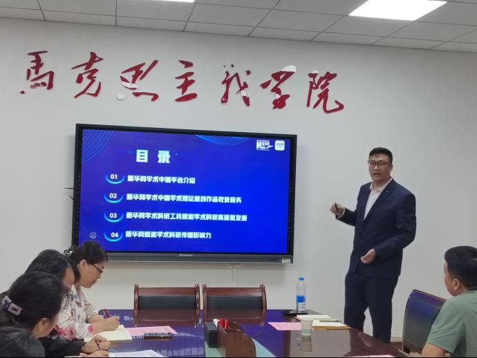 会上,张萍院长首先对新华网“学术中国”平台出版服务中心王云峰主任的到来表示欢迎和感谢,她介绍了目前学院发展、学科建设、科研创新、人才培养等方面取得的成果及未来发展规划等。在主题报告环节,王云峰主任以“新华网‘学术中国’赋能人才教育科技高质量发展”为题,从“新华网学术中国平台基本情况”“学术中国学术理论原创作品收录服务”“学术科研工具赋能学术科研高质量发展”“赋能学术科研传播影响力”等四个方面介绍了平台在推动高校思政教育与科研创新深度融合方面的实践探索与赋能方案,强调要加速推进教育与实践协同创新和高质量发展,切实提高高等院校教职工的教育教学和学术科研能力,努力为推动教育强国建设提供学术动力。