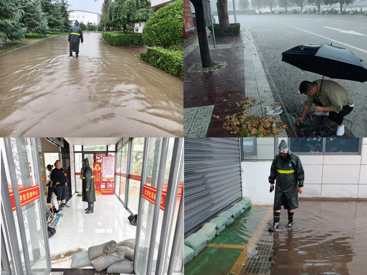 积极“快速响应”。强降雨突袭,校园积水险情快速显现。后勤服务中心立即启动防汛应急响应,中心领导班子成员第一时间赶赴积水严重区域,通过现场勘察快速制定处置方案,并根据险情将后勤人员划分为四支专项突击队,明确人员职责,确保汛期 “召之即来、来之能战”。