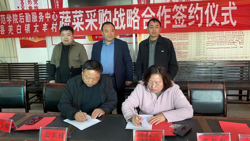 在太丰村村委院内,王争辉一行参观了辣椒、茄子、豆角、包菜等当地受众面广、产量足、销量大的蔬菜的品类,太丰村蔬菜销售代办负责人详细介绍了辣椒的种植面积、上市周期、口感差异、适用菜肴、销售价格等。在洽谈会上,双方就村情、校情做了交流,探讨了合作形式,三方签订了蔬菜采购协议书,达成了合作意向。当天,山林绿惠蔬菜配送公司率先订购了近2000斤蔬菜。