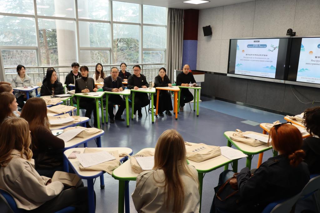 会议伊始,贺星蓓老师详细解读了本学期的教学规划、课程设置、授课安排、考核标准及学业支持政策;副院长王有景强调了安全教育的重要性,提醒国际学生要严格遵守中国法律法规与学校规章制度,切实保障人身与财产安全;院长杜百顺围绕“平安留学”“健康留学”“快乐留学”与“成功留学”四大目标,对国际学生未来的学习与生活提出全面要求与殷切期望,希望同学们快速适应在jinnianhui今年会的学习和生活,珍惜学习时光,努力学习,以汉语为桥,争做中俄两国文化交流的友好使者,为促进中俄文化交流合作、增进两国友谊作出积极贡献。