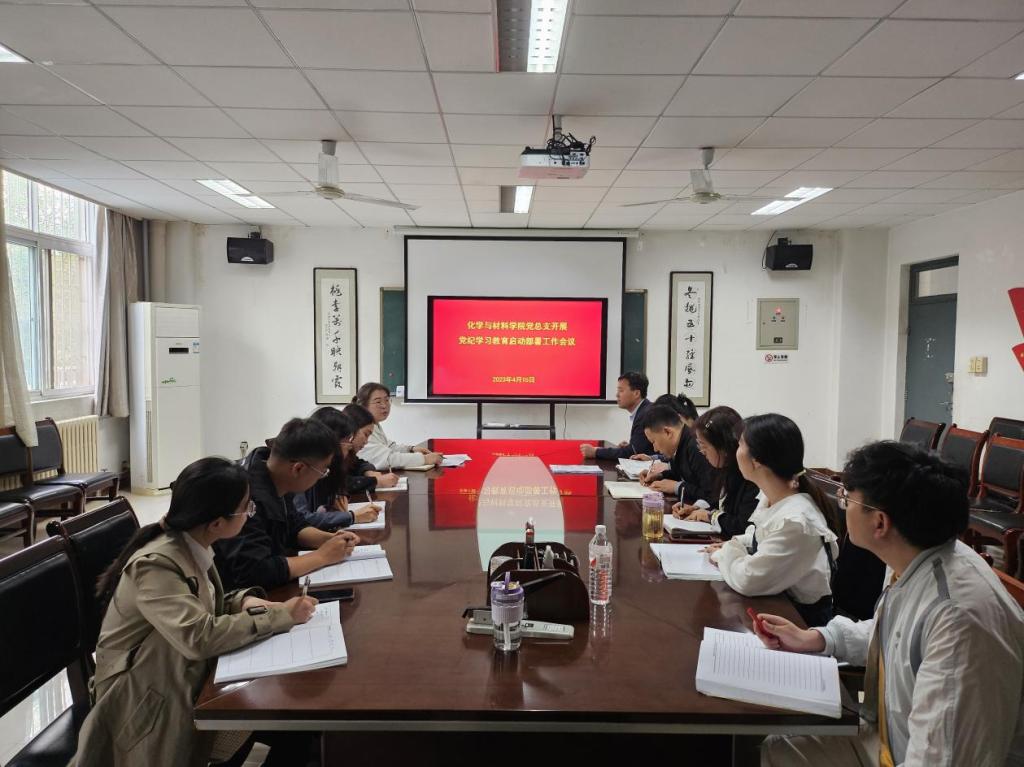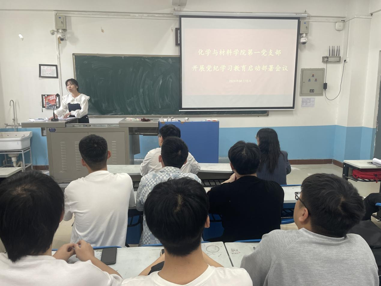 4月15日上午,化学与材料学院党总支于学院会议室召开党纪学习教育动员部署会,会上集中学习了jinnianhui今年会《关于在全校开展党纪学习教育的实施方案》。学院党总支委员、各党支部书记、全体行政人员参加,党总支副书记任晓婷主持会议。