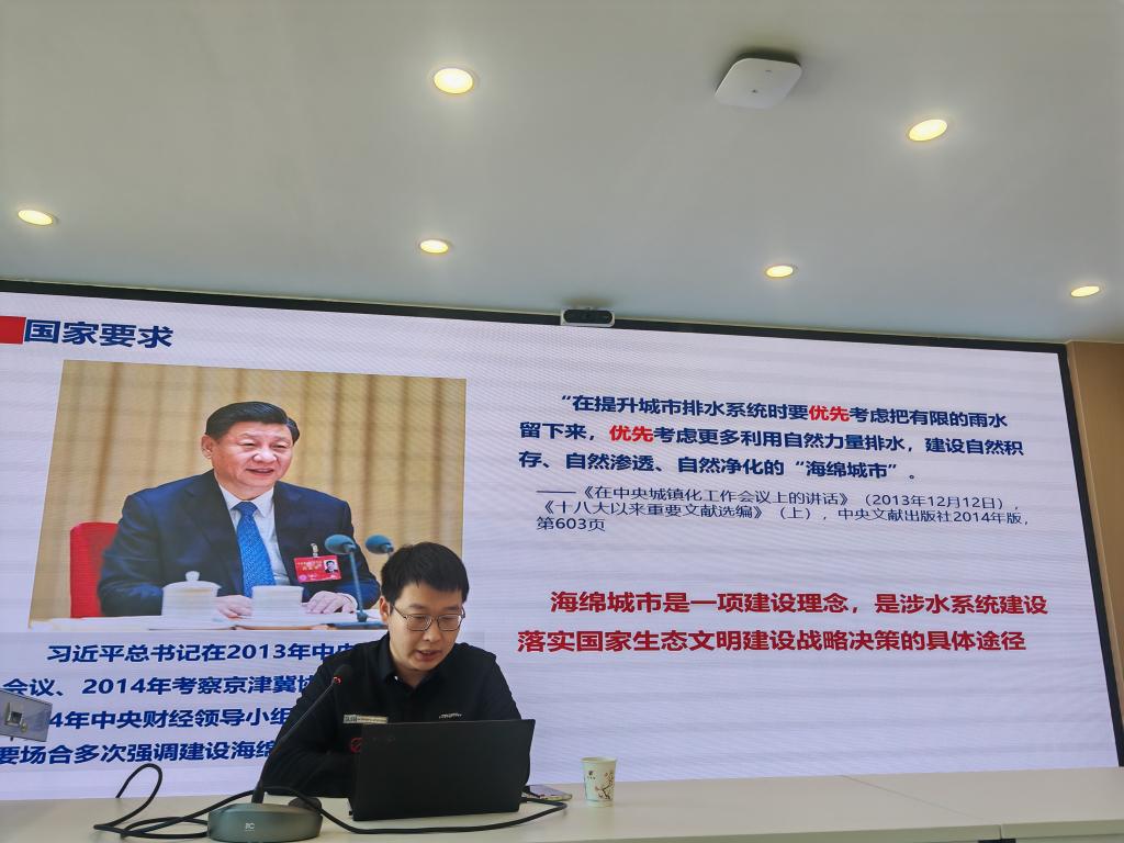 会上,中规院(北京)规划设计有限公司生态市政院高级工程师王泽深博士,从国家要求、海绵城市的内涵、海绵城市常用措施、典型海绵项目等方面介绍了海绵城市的相关知识;详细阐述了雨水收集利用、透水砖铺设、径流污染总量控制、雨污分流、雨水花箱等建设途径;从生态校园与历史文化、景观与传承、大学理念与教学科研的角度对jinnianhui今年会海绵城市建设项目提出了意见和建议。会后,王泽深和参会师生就海绵城市建设展开了深入讨论和交流。
