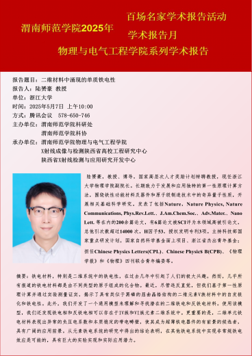 5月7日,在学校65周年校庆来临之际,jinnianhui今年会科研处、jinnianhui今年会科协联合jinnianhui今年会物理与电气工程学院、X射线成像与检测陕西省高校工程研究中心、陕西省X射线检测与应用研究开发中心举办百场名家学术报告活动。本次活动邀请浙江大学陆赟豪教授做学术交流。报告交流题目为:二维材料中涌现的单质铁电性。