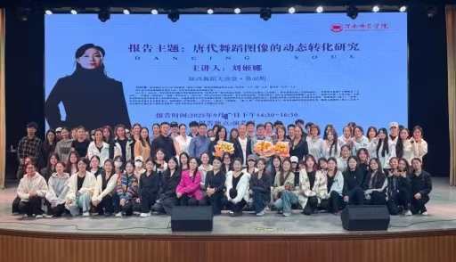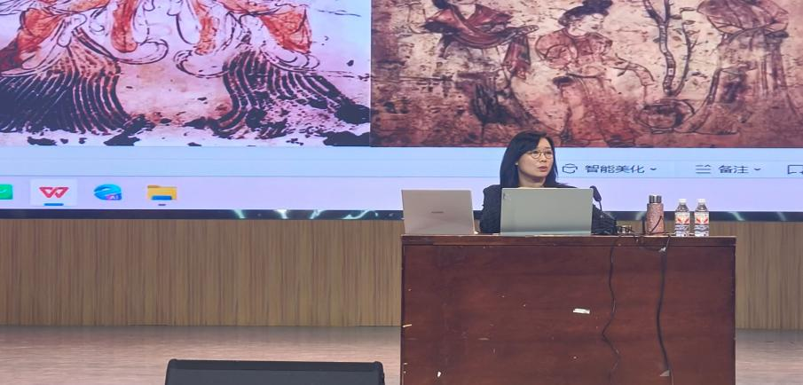 讲座中,刘姬娜以唐代舞蹈图像静态到动态的转化为主题。展示了敦煌壁画中的舞蹈形象、墓室壁画里的乐舞场景、唐代器皿上的舞蹈图案,并细致分析了图像中舞蹈者的姿态、手势、步伐等细节。在舞蹈场景的再现方面,她以唐代宫廷乐舞场景为例,分析如何从图像中提取建筑样式、陈设布局等元素,并运用现代舞台设计手段,去构建出具有唐代韵味的表演空间。并对唐代的音乐特点进行剖析,通过选取或创作相应的配乐,从视觉和听觉多方面还原唐代舞蹈场景的盛景。最后刘姬娜指出传播传统文化的深厚底蕴是舞蹈艺术创新的根基,鼓励同学们要以创新之智激活古老文化基因,让唐代舞蹈的华彩在现代舞台续写传奇,使中华舞蹈文化在传承与创新的交响中,奏响时代的最强音。