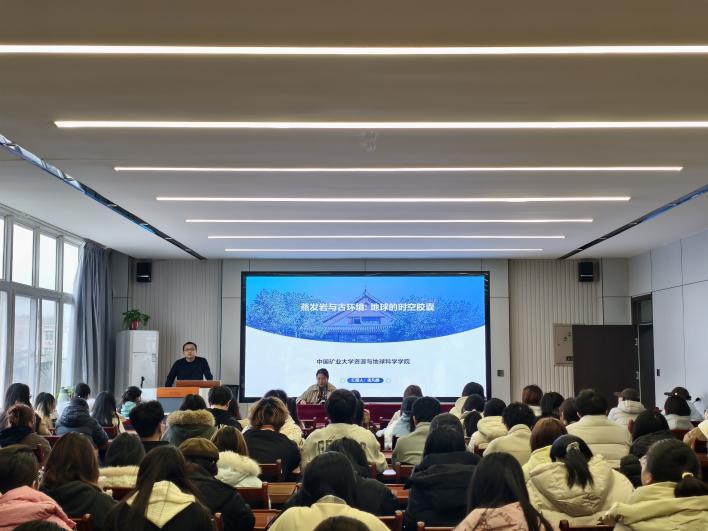 孟凡巍教授围绕蒸发岩的形成机制、古环境信息记录、油气勘探应用等核心内容展开分享,阐明蒸发岩作为“地球时空胶囊”,能够完整保存地质历史时期水圈、大气圈甚至生物圈的原始信息,其形成与全球古气候、古地理格局密切相关。同时,孟教授结合团队研究成果,介绍了利用石盐流体包裹体解析古海水成分、还原古代水温,以及破解中国东部古近纪海侵争议的关键研究突破,展现了蒸发岩研究在跨学科领域的应用潜力。报告过程中,参会师生专注聆听、认真记录、积极发言,会场学术气息浓厚,交流探讨氛围热烈。