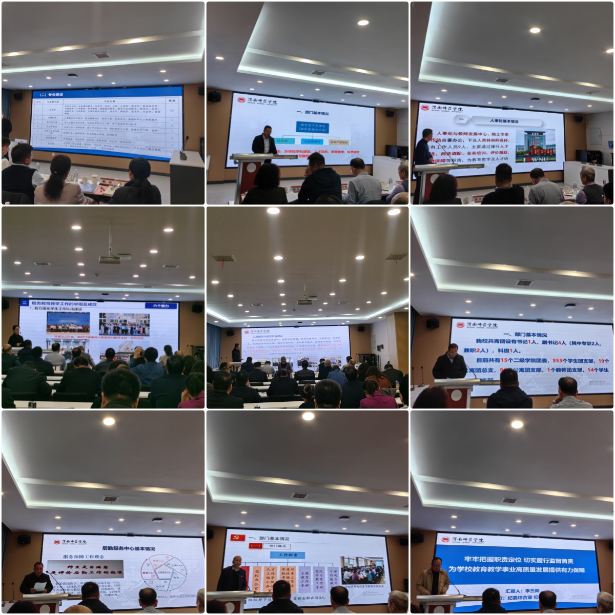 会上,15个二级学院院长就学院现状、育人举措及成效、学院特色优势、不足及努力方向的自评自建工作作了汇报,教务处、党政办公室、计划财务处、国有资产管理处、人事处、宣传部、学生工作部、发展规划处、团委、后勤服务中心、组织部、纪委综合室、纪检监察室、国际交流处负责人代表职能处室围绕服务教育教学工作的举措与成效、特色与亮点、存在的问题及规划作了汇报。