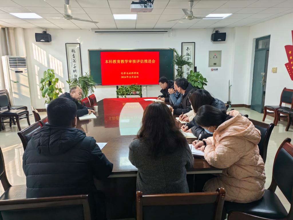 12月23日下午,化学与材料学院在会议室A101组织召开了学院本科教育教学审核评估工作推进会。校党委委员、副院长卢爱刚,学院处科级干部参加会议,会议由学院院长刘展晴主持。