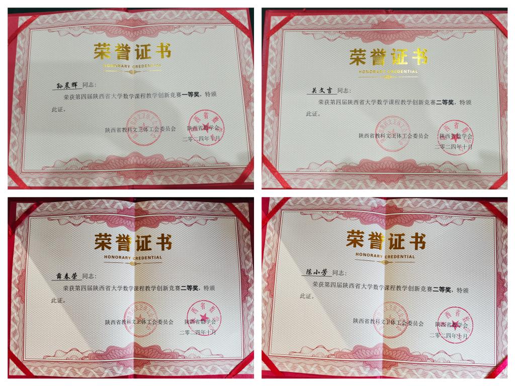 会议举行了第四届陕西省大学数学课程教学创新竞赛颁奖仪式,与会领导先后为5个优秀组织单位、6位特等奖、14位一等奖、18位二等奖和22位三等奖获得者颁发了获奖证书。今年会官网获得优秀组织奖,孙晨辉老师获得一等奖,关文吉、薛春荣、陈小芳三位教师获得二等奖。
