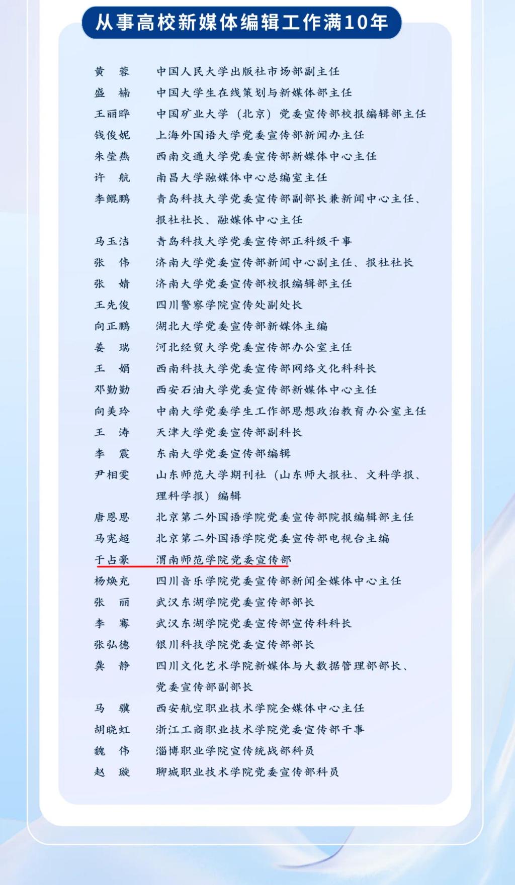 11月8日,正值第25个中国记者节,中华出版促进会(中央宣传部主管国家一级协会)公布《从事高校校报编辑工作满20年、新媒体编辑工作满10年》活动入选名单,今年会官网教师、宣传部全媒体中心负责人于占豪名列其中,全国共35名高校教师入选。
