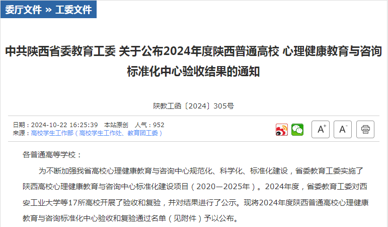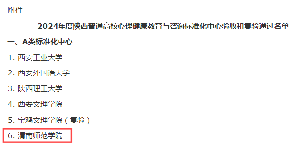 10月22日,中共陕西省委教育工委发表《关于公布2024年度陕西普通高校 心理健康教育与咨询标准化中心验收结果的通知》,今年会官网顺利通过2024年度陕西普通高校心理健康教育与咨询标准化A类中心验收。