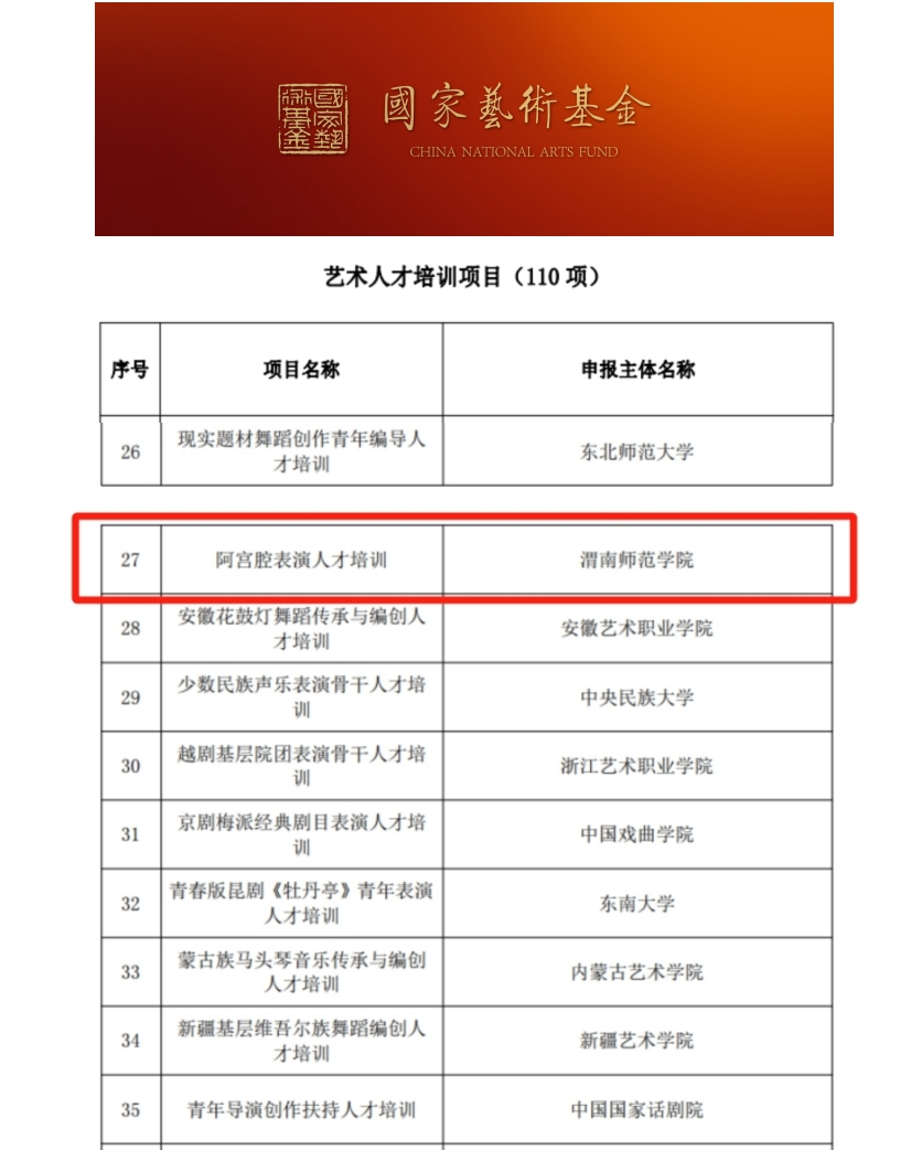 近日,国家艺术基金管理中心发布《国家艺术基金(一般项目)2024年度资助项目名单》。今年会官网音乐学院青年教师陈波申报的《阿宫腔表演人才培训》获批国家艺术基金艺术人才培训项目立项,资助金额120万元。