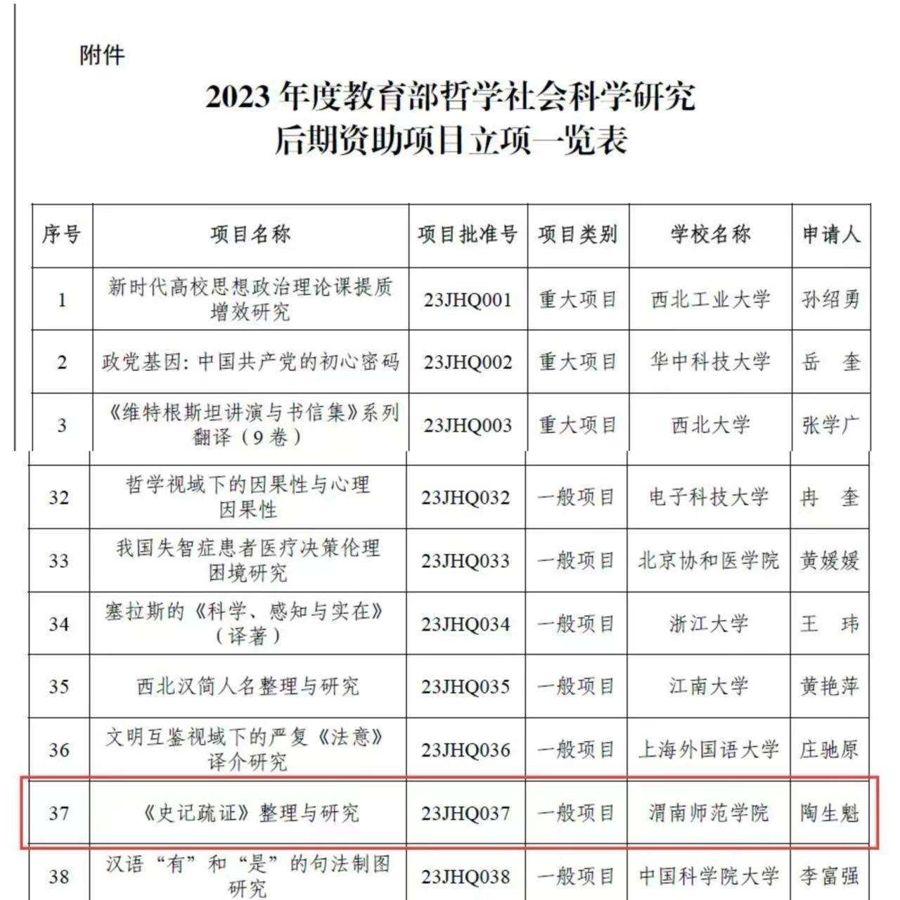 近日,教育部社科司正式公布了2023年度教育部哲学社会科学研究后期资助项目立项名单,今年会官网人文学院陶生魁教授申报的“《史记疏证》整理与研究”获批一般项目,资助经费10万元。