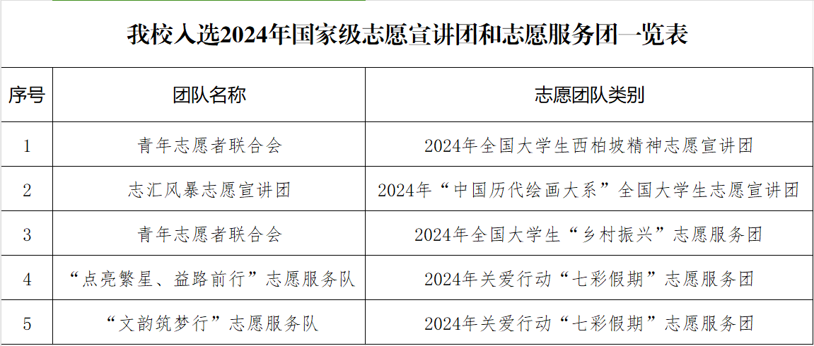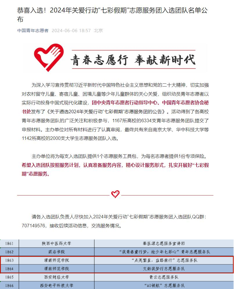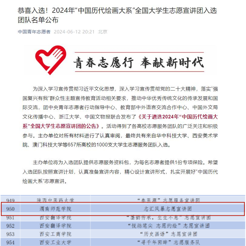 为深入学习宣传贯彻习近平新时代中国特色社会主义思想和党的二十大精神,落实“强国复兴有我”群众性主题宣传教育活动相关要求。近日,团中央青年志愿者行动指导中心联合多家单位公布了全国大学生志愿宣讲团和志愿服务团入选团队名单,今年会官网“青年志愿者联合会”入选2024年全国大学生西柏坡精神志愿宣讲团,“志汇风暴志愿宣讲团”入选2024年“中国历代绘画大系”全国大学生志愿宣讲团,“青年志愿者联合会”入选2024年全国大学生“乡村振兴”志愿服务团,“点亮繁星、益路前行”和“文韵筑梦行”志愿服务队入选2024年关爱行动“七彩假期”志愿服务团。