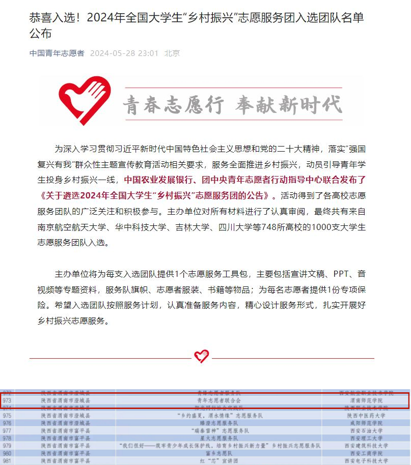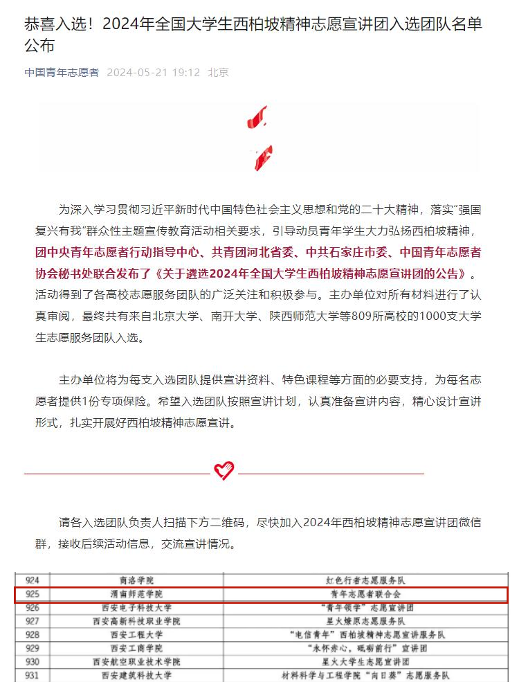 今年会官网入选的五支学生团队将严格落实团中央青年志愿者行动指导中心相关要求,结合今年会官网实际,广泛开展志愿宣讲和服务活动,充分发挥“学生志愿宣讲团和志愿服务团”力量。校团委也将以此为契机,培养广大渭师青年勇担时代重任,践行志愿精神,用实际行动彰显青春风采,贡献青春力量!(通讯员 潘涛 审核人 赵琦)